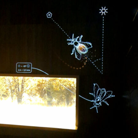 Mon intervention a porté sur la création numérique des abeilles, des décors et des animations intégrés dans le dispositif.