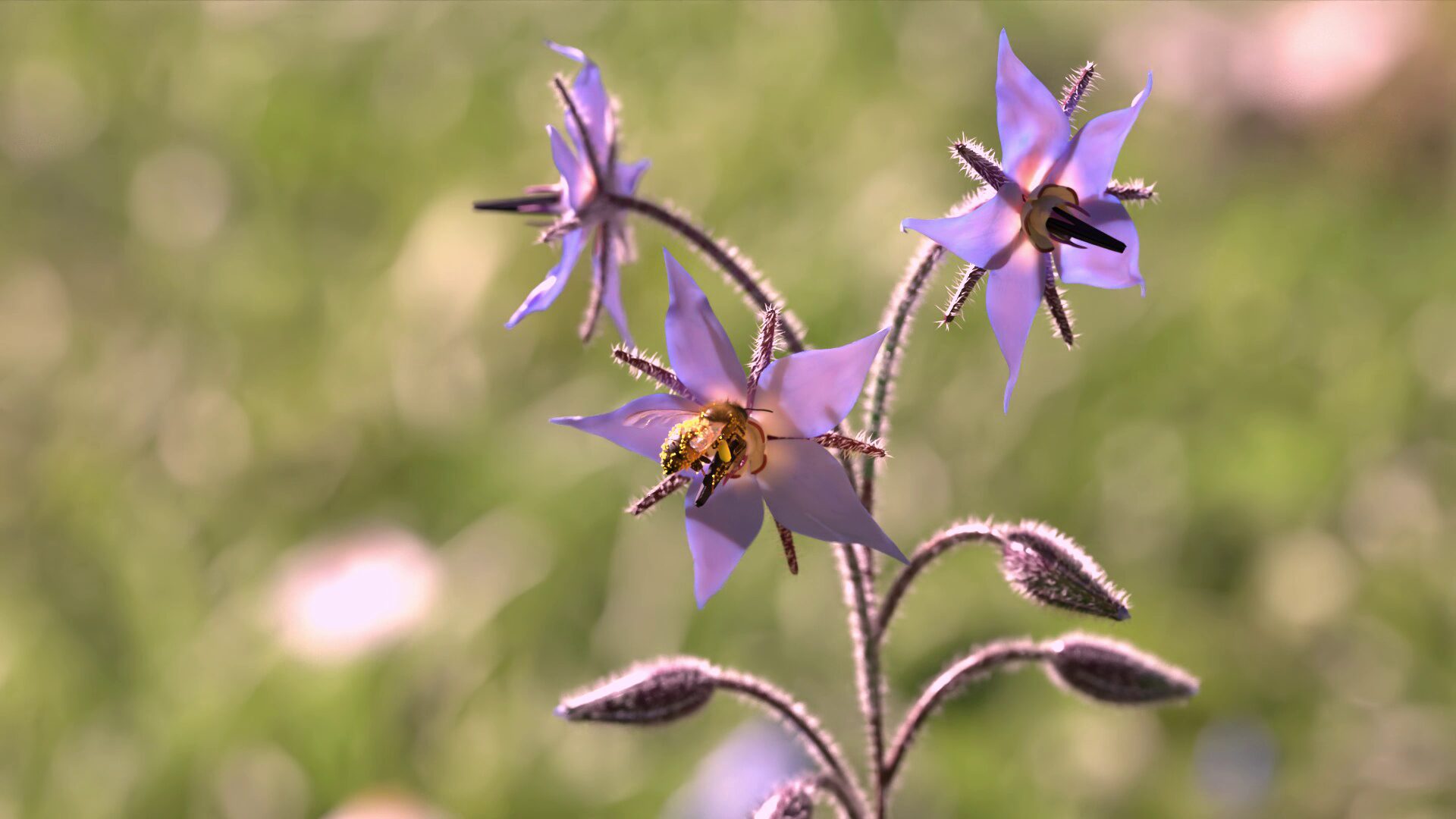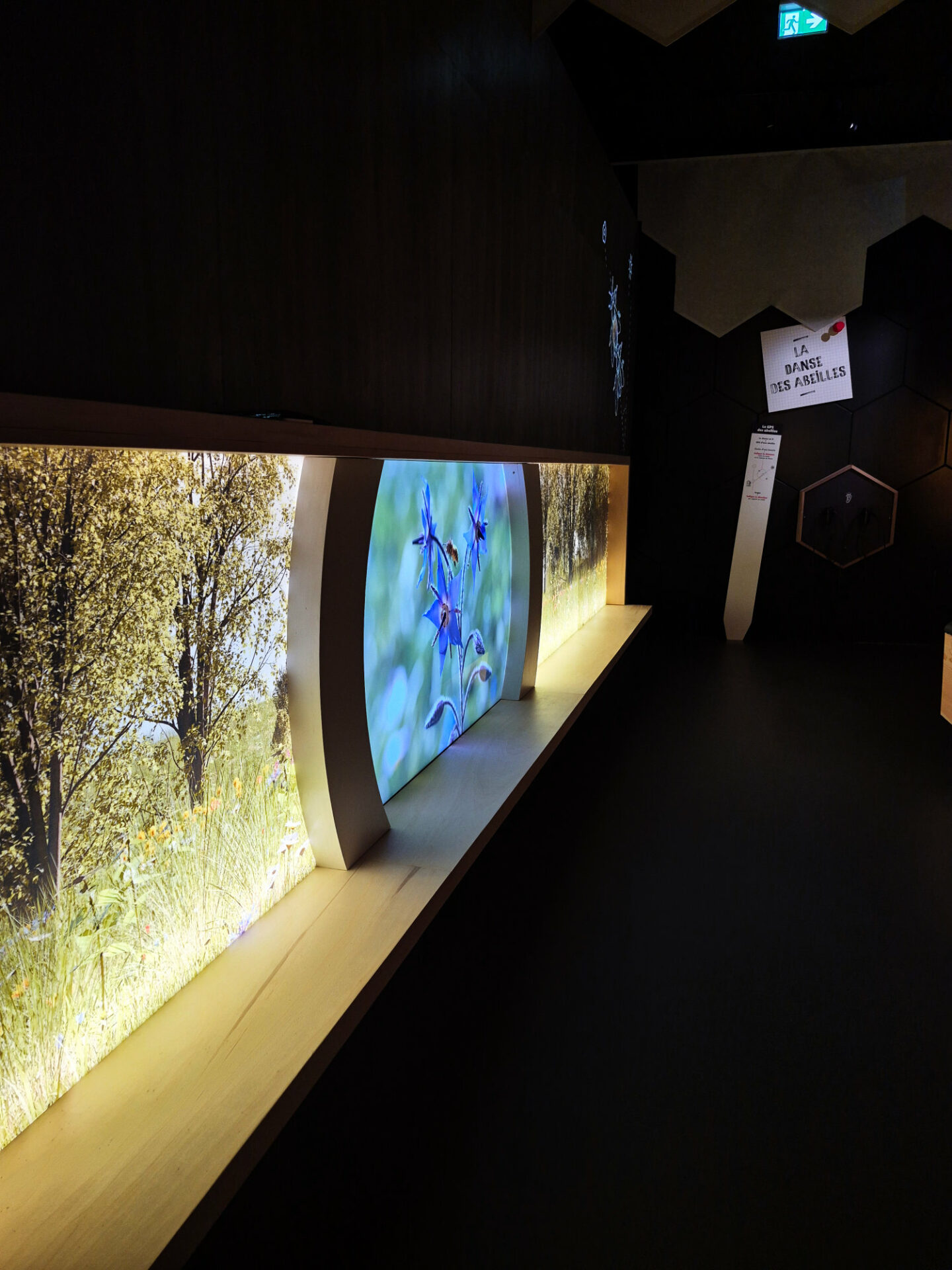 Mon intervention a porté sur la création numérique des abeilles, des décors et des animations intégrés dans le dispositif.